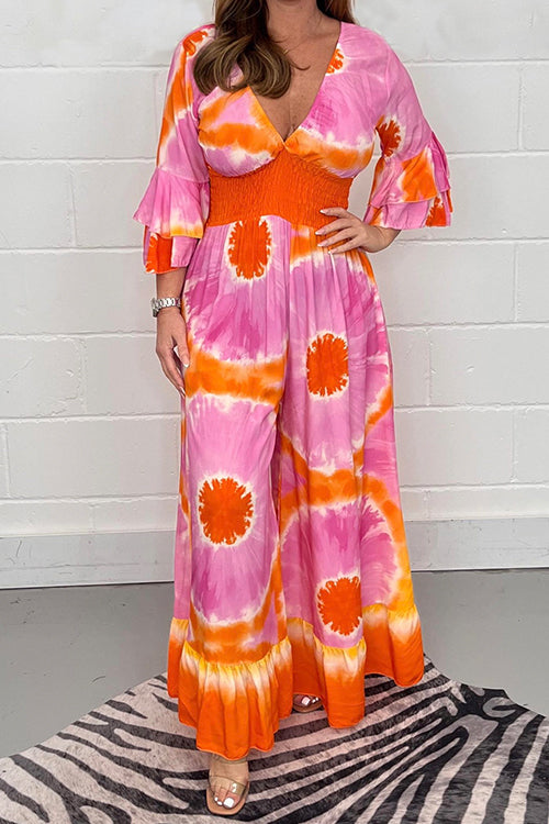 V Neck Bell Sleeves Smocked Waist Wide Leg Printed Jumpsuit