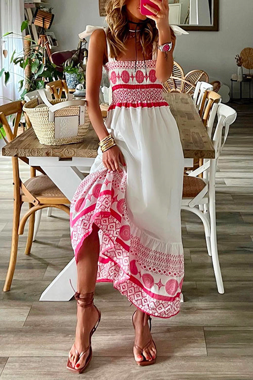 Smocked Tie Shoulder Printed Ruffle Maxi Cami Dress