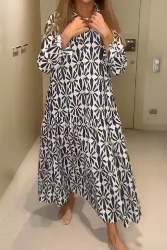 Loose Printed Long Sleeves Loose V-Neck Maxi Dresses