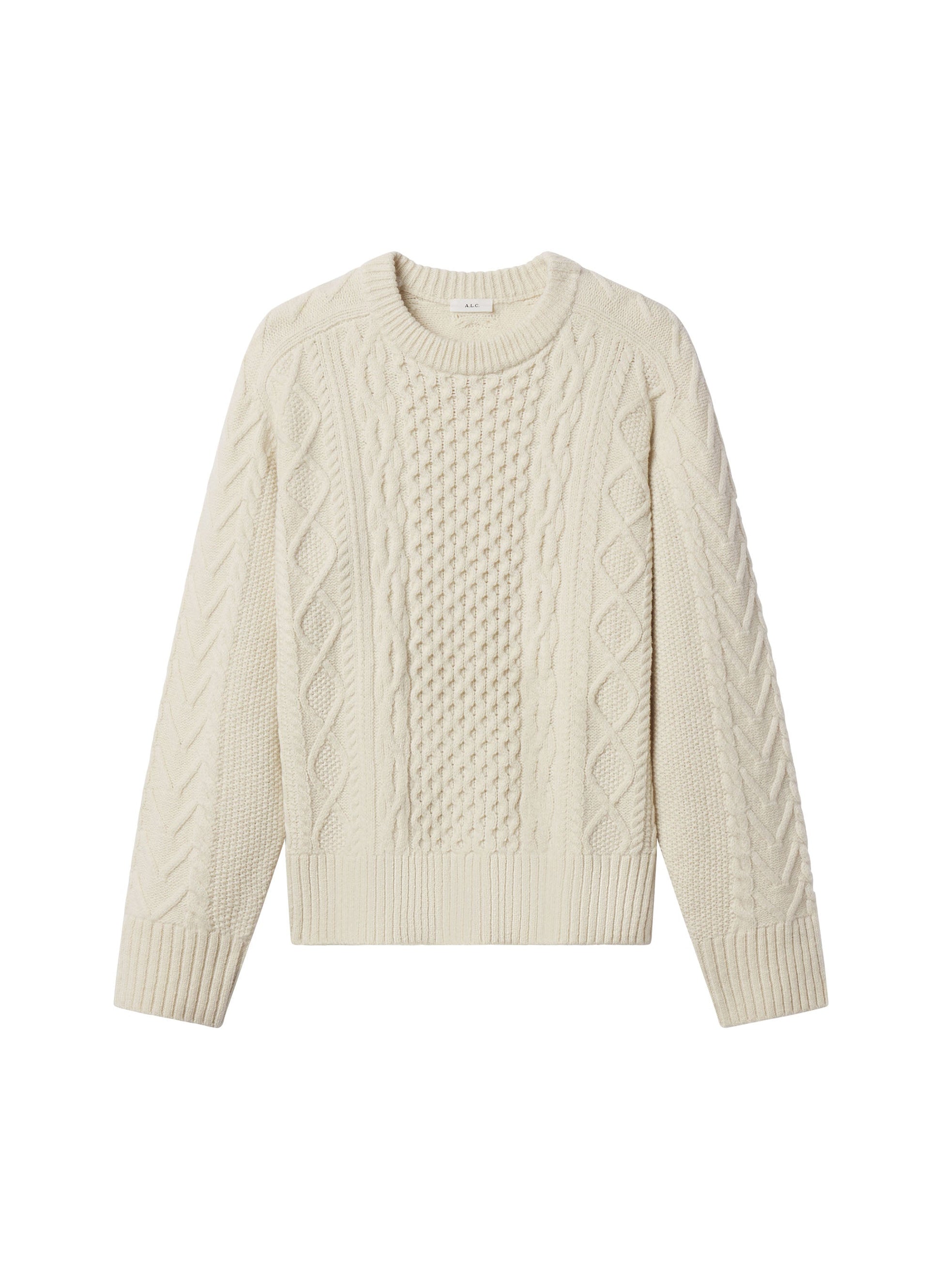 The cableknit Kyra Sweater is crafted from our lofty ladder merino fabric in an off-white hue. This oversized silhouette features a crewneck, dropped shoulders and knuckle-grazing sleeves. Shop Sweaters.